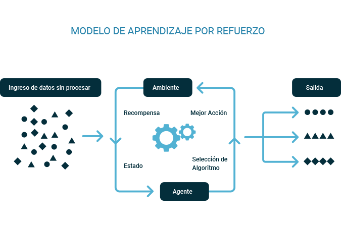 Por otro lado, cuando no contamos con información precisa sobre que esperamos como resultado, pero si podemos evaluar nuestros resultados, basados en si la decisión que el agente toma es buena o mala, podemos usar aprendizaje por refuerzo. Este tipo de aprendizaje es considerado un subtipo del aprendizaje supervisado.